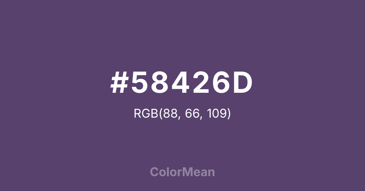 #58426D RGB value is (88, 66, 109). The hex color red value is 88, green is 66, and blue is 109. Its HSL format shows a hue of 271°, saturation of 25 percent, and lightness of 34 percent. The CMYK process values are 19 percent, 39 percent, 0 percent, 57 percent.