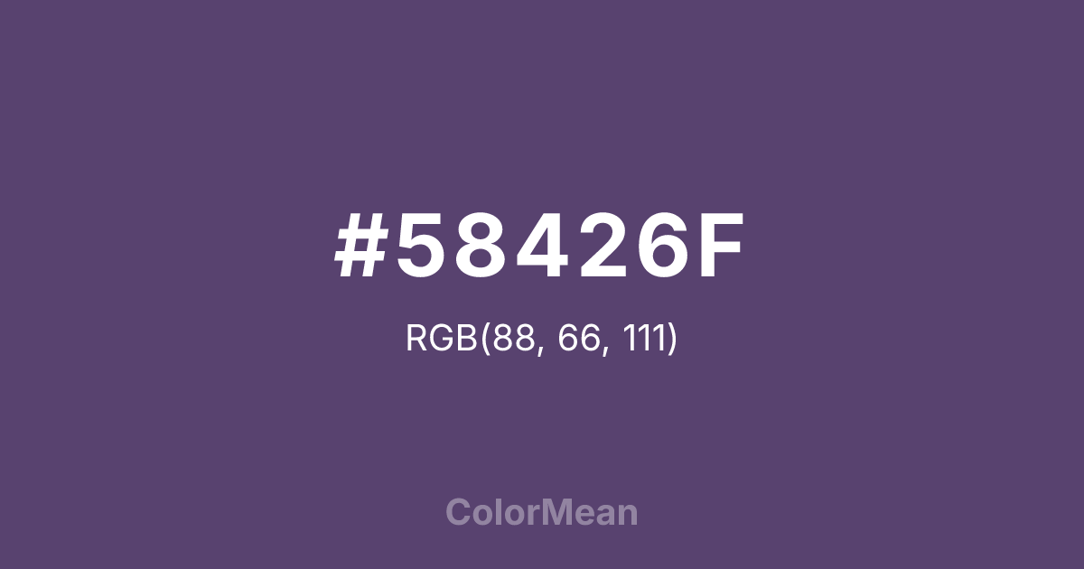 #58426F RGB value is (88, 66, 111). The hex color red value is 88, green is 66, and blue is 111. Its HSL format shows a hue of 269°, saturation of 25 percent, and lightness of 35 percent. The CMYK process values are 21 percent, 41 percent, 0 percent, 56 percent.