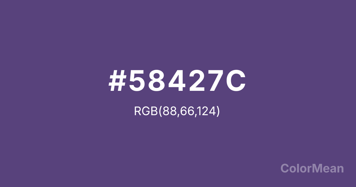 Cyber Grape (#58427C) RGB value is (88, 66, 124). The hex color red value is 88, green is 66, and blue is 124. Its HSL format shows a hue of 263°, saturation of 31 percent, and lightness of 37 percent. The CMYK process values are 29 percent, 47 percent, 0 percent, 51 percent.