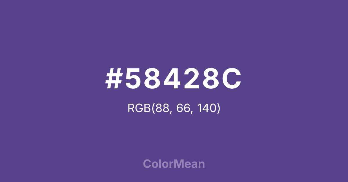 #58428C RGB value is (88, 66, 140). The hex color red value is 88, green is 66, and blue is 140. Its HSL format shows a hue of 258°, saturation of 36 percent, and lightness of 40 percent. The CMYK process values are 37 percent, 53 percent, 0 percent, 45 percent.