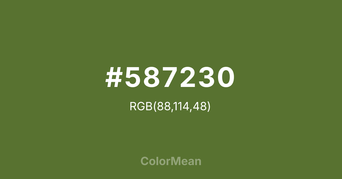 #587230 RGB value is (88, 114, 48). The hex color red value is 88, green is 114, and blue is 48. Its HSL format shows a hue of 84°, saturation of 41 percent, and lightness of 32 percent. The CMYK process values are 23 percent, 0 percent, 58 percent, 55 percent.