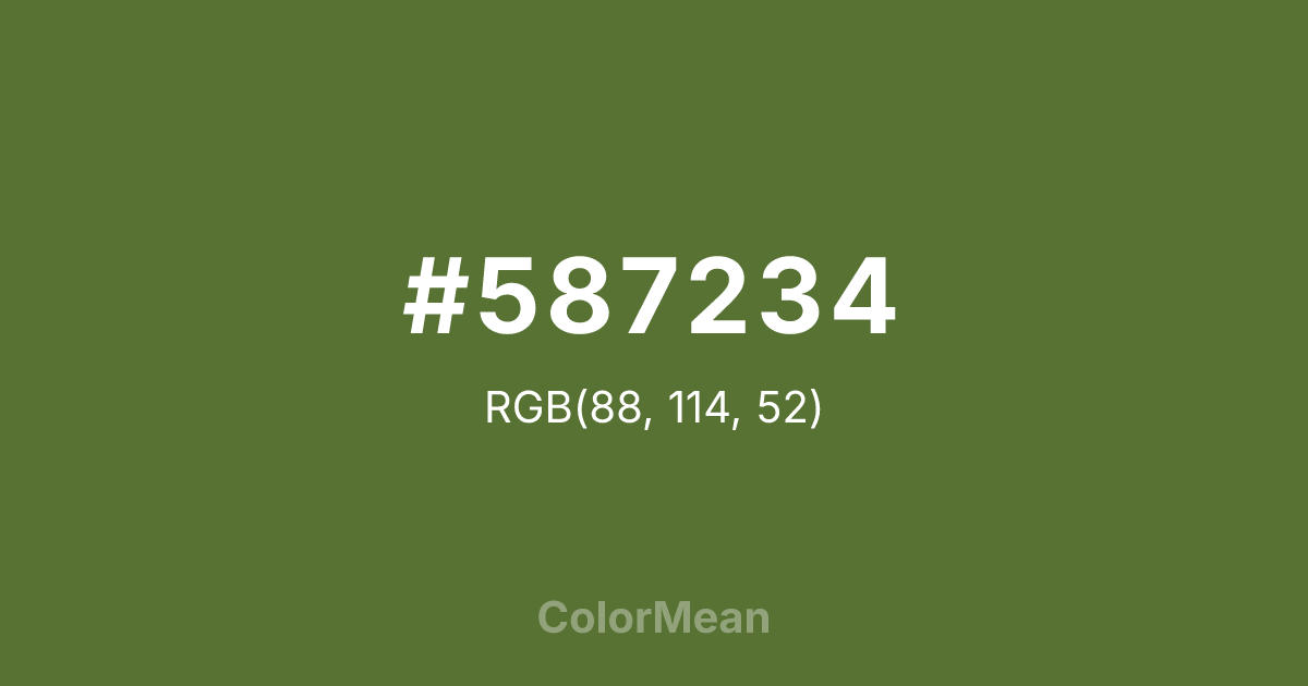 #587234 RGB value is (88, 114, 52). The hex color red value is 88, green is 114, and blue is 52. Its HSL format shows a hue of 85°, saturation of 37 percent, and lightness of 33 percent. The CMYK process values are 23 percent, 0 percent, 54 percent, 55 percent.