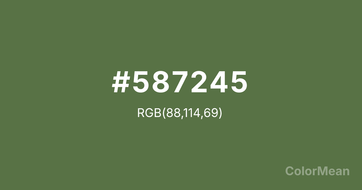 #587245 RGB value is (88, 114, 69). The hex color red value is 88, green is 114, and blue is 69. Its HSL format shows a hue of 95°, saturation of 25 percent, and lightness of 36 percent. The CMYK process values are 23 percent, 0 percent, 39 percent, 55 percent.