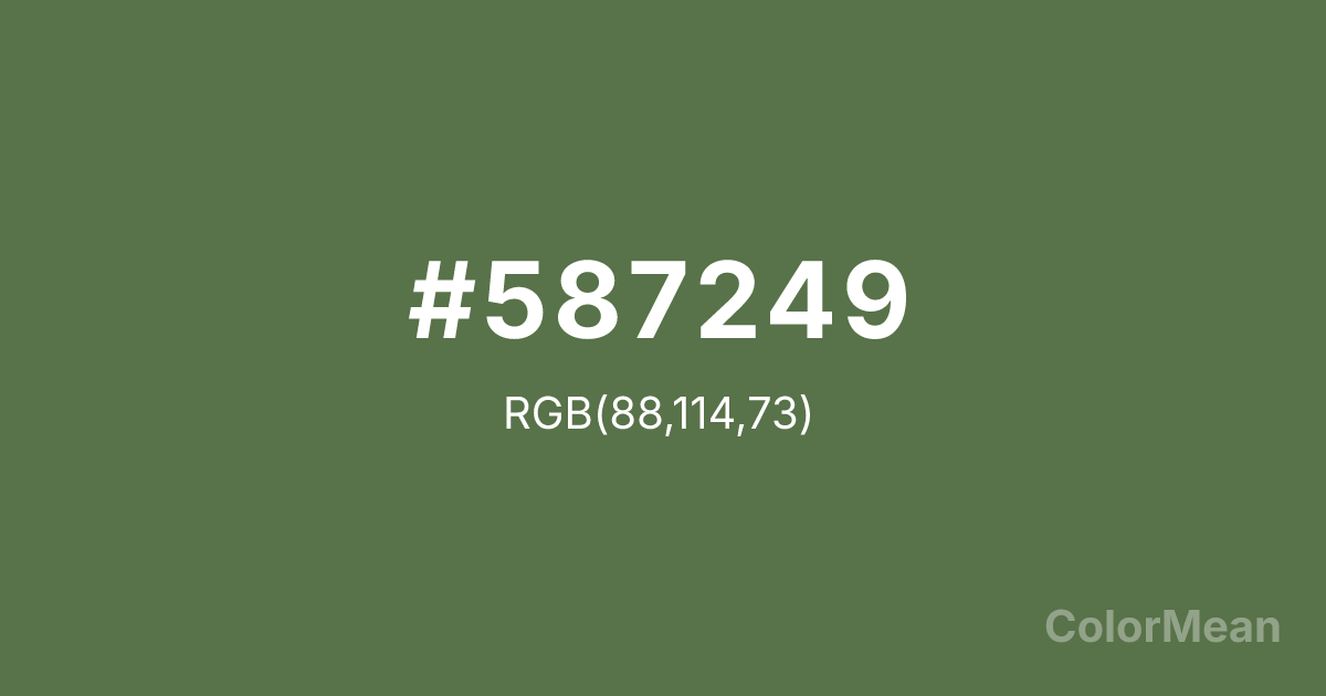 #587249 RGB value is (88, 114, 73). The hex color red value is 88, green is 114, and blue is 73. Its HSL format shows a hue of 98°, saturation of 22 percent, and lightness of 37 percent. The CMYK process values are 23 percent, 0 percent, 36 percent, 55 percent.