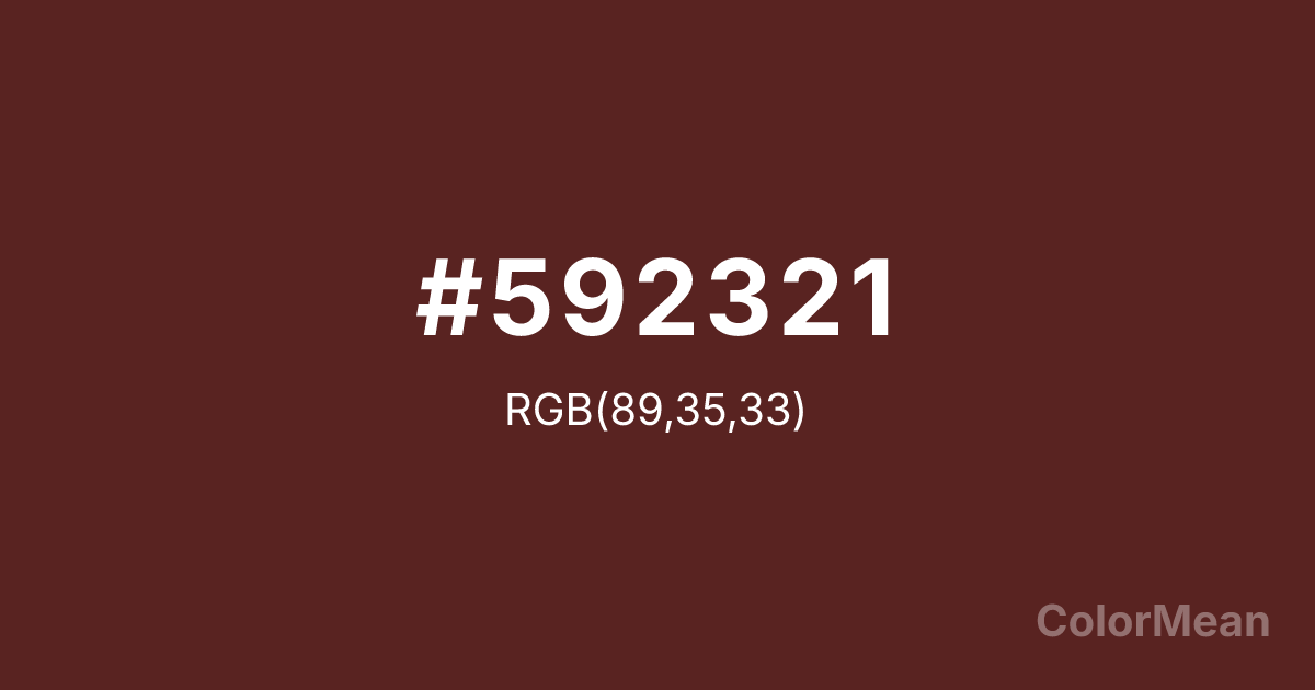 Red Brown (#592321) RGB value is (89, 35, 33). The hex color red value is 89, green is 35, and blue is 33. Its HSL format shows a hue of 2°, saturation of 46 percent, and lightness of 24 percent. The CMYK process values are 0 percent, 61 percent, 63 percent, 65 percent.