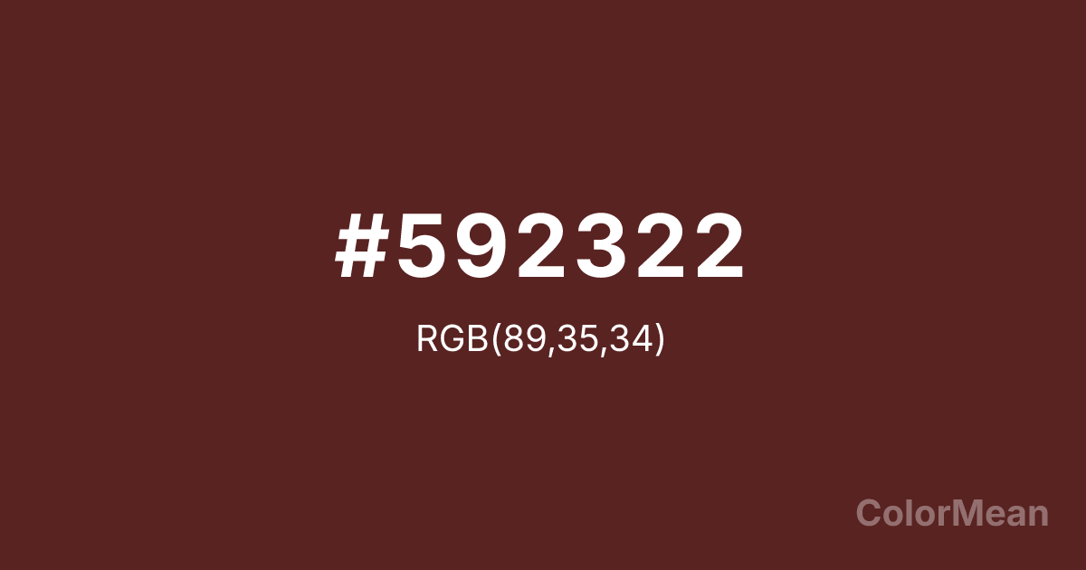 #592322 RGB value is (89, 35, 34). The hex color red value is 89, green is 35, and blue is 34. Its HSL format shows a hue of 1°, saturation of 45 percent, and lightness of 24 percent. The CMYK process values are 0 percent, 61 percent, 62 percent, 65 percent.