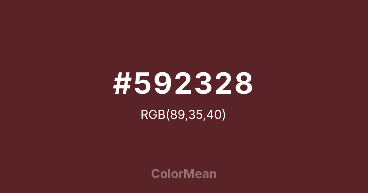 #592328 RGB value is (89, 35, 40). The hex color red value is 89, green is 35, and blue is 40. Its HSL format shows a hue of 354°, saturation of 44 percent, and lightness of 24 percent. The CMYK process values are 0 percent, 61 percent, 55 percent, 65 percent.