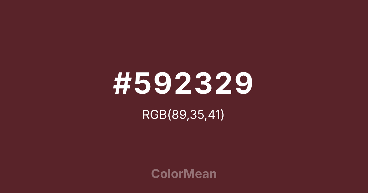 #592329 RGB value is (89, 35, 41). The hex color red value is 89, green is 35, and blue is 41. Its HSL format shows a hue of 353°, saturation of 44 percent, and lightness of 24 percent. The CMYK process values are 0 percent, 61 percent, 54 percent, 65 percent.
