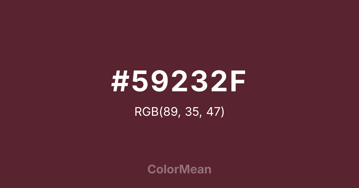 #59232F RGB value is (89, 35, 47). The hex color red value is 89, green is 35, and blue is 47. Its HSL format shows a hue of 347°, saturation of 44 percent, and lightness of 24 percent. The CMYK process values are 0 percent, 61 percent, 47 percent, 65 percent.