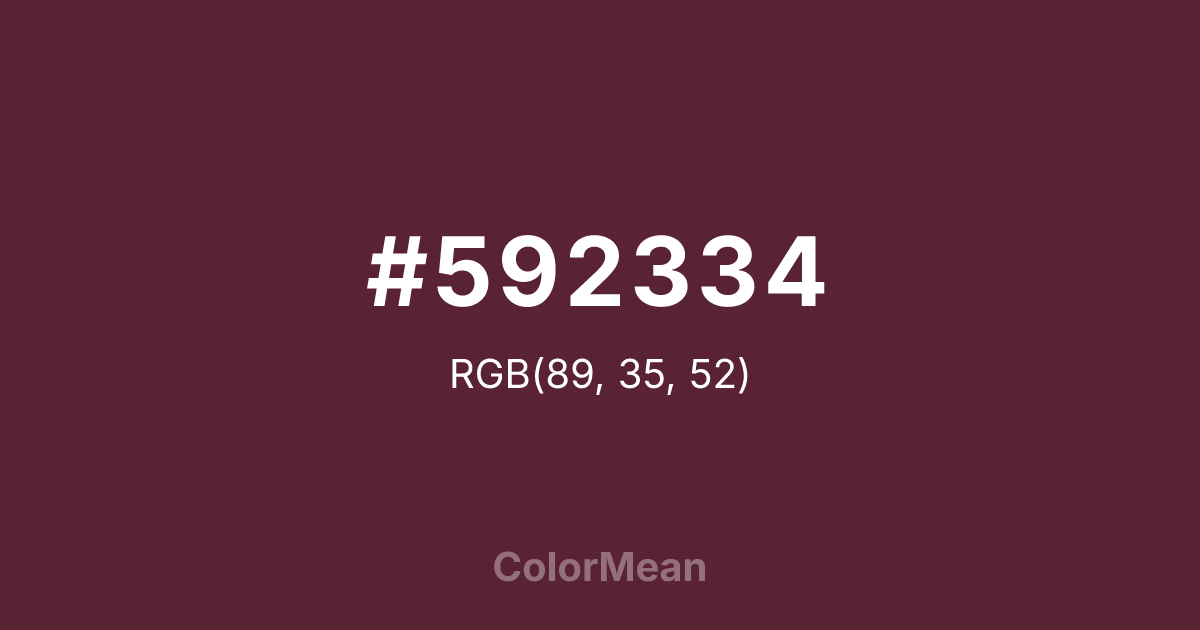 #592334 RGB value is (89, 35, 52). The hex color red value is 89, green is 35, and blue is 52. Its HSL format shows a hue of 341°, saturation of 44 percent, and lightness of 24 percent. The CMYK process values are 0 percent, 61 percent, 42 percent, 65 percent.