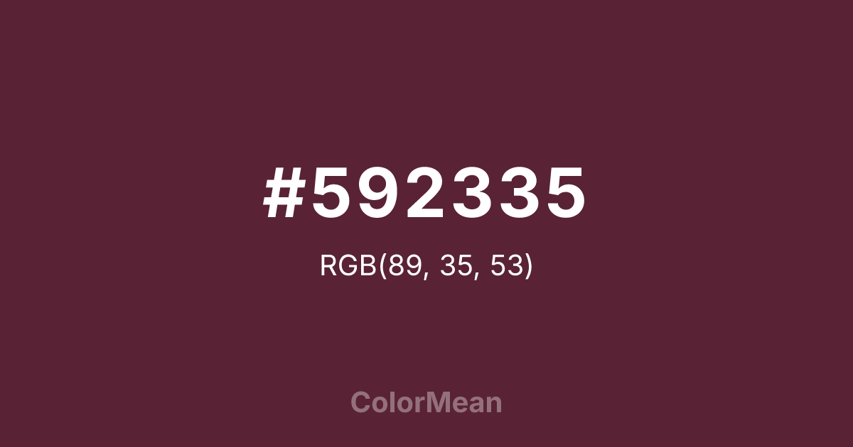 #592335 RGB value is (89, 35, 53). The hex color red value is 89, green is 35, and blue is 53. Its HSL format shows a hue of 340°, saturation of 44 percent, and lightness of 24 percent. The CMYK process values are 0 percent, 61 percent, 40 percent, 65 percent.