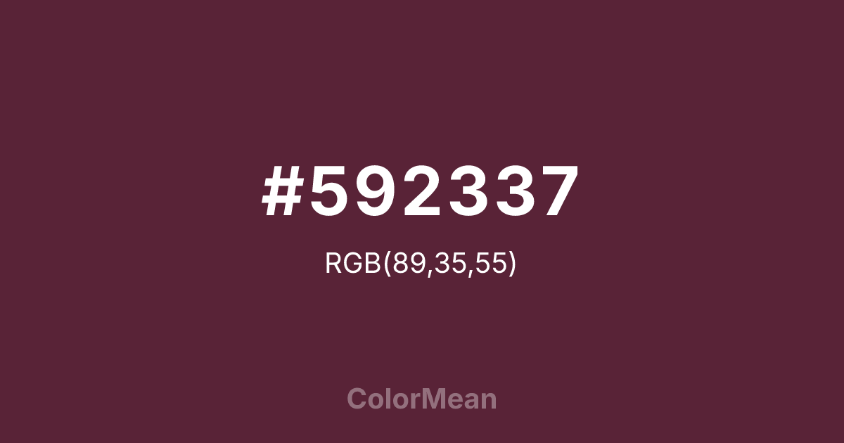 #592337 RGB value is (89, 35, 55). The hex color red value is 89, green is 35, and blue is 55. Its HSL format shows a hue of 338°, saturation of 44 percent, and lightness of 24 percent. The CMYK process values are 0 percent, 61 percent, 38 percent, 65 percent.
