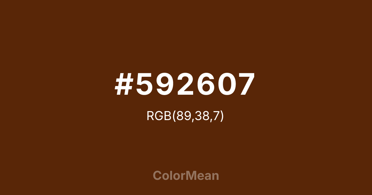 #592607 RGB value is (89, 38, 7). The hex color red value is 89, green is 38, and blue is 7. Its HSL format shows a hue of 23°, saturation of 85 percent, and lightness of 19 percent. The CMYK process values are 0 percent, 57 percent, 92 percent, 65 percent.