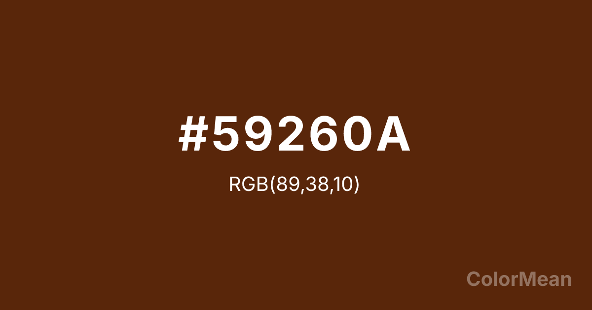 #59260A RGB value is (89, 38, 10). The hex color red value is 89, green is 38, and blue is 10. Its HSL format shows a hue of 21°, saturation of 80 percent, and lightness of 19 percent. The CMYK process values are 0 percent, 57 percent, 89 percent, 65 percent.