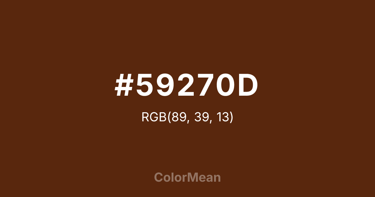#59270D RGB value is (89, 39, 13). The hex color red value is 89, green is 39, and blue is 13. Its HSL format shows a hue of 21°, saturation of 75 percent, and lightness of 20 percent. The CMYK process values are 0 percent, 56 percent, 85 percent, 65 percent.