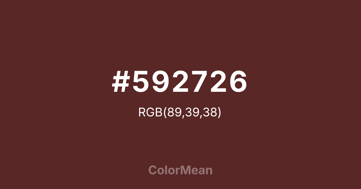 #592726 RGB value is (89, 39, 38). The hex color red value is 89, green is 39, and blue is 38. Its HSL format shows a hue of 1°, saturation of 40 percent, and lightness of 25 percent. The CMYK process values are 0 percent, 56 percent, 57 percent, 65 percent.