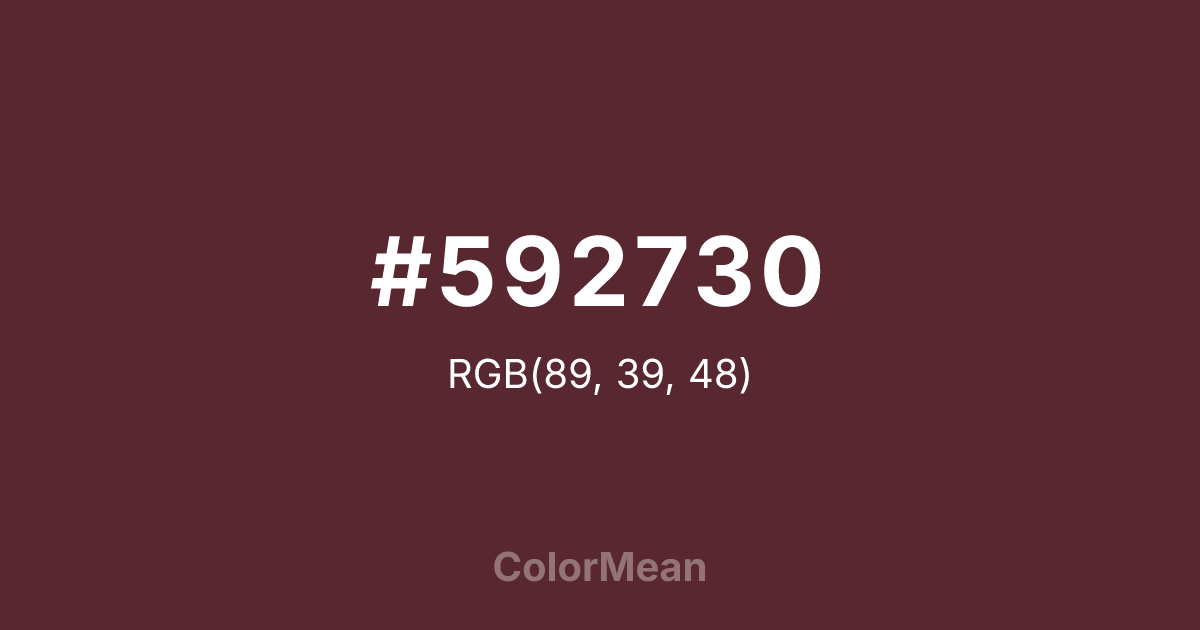 #592730 RGB value is (89, 39, 48). The hex color red value is 89, green is 39, and blue is 48. Its HSL format shows a hue of 349°, saturation of 39 percent, and lightness of 25 percent. The CMYK process values are 0 percent, 56 percent, 46 percent, 65 percent.