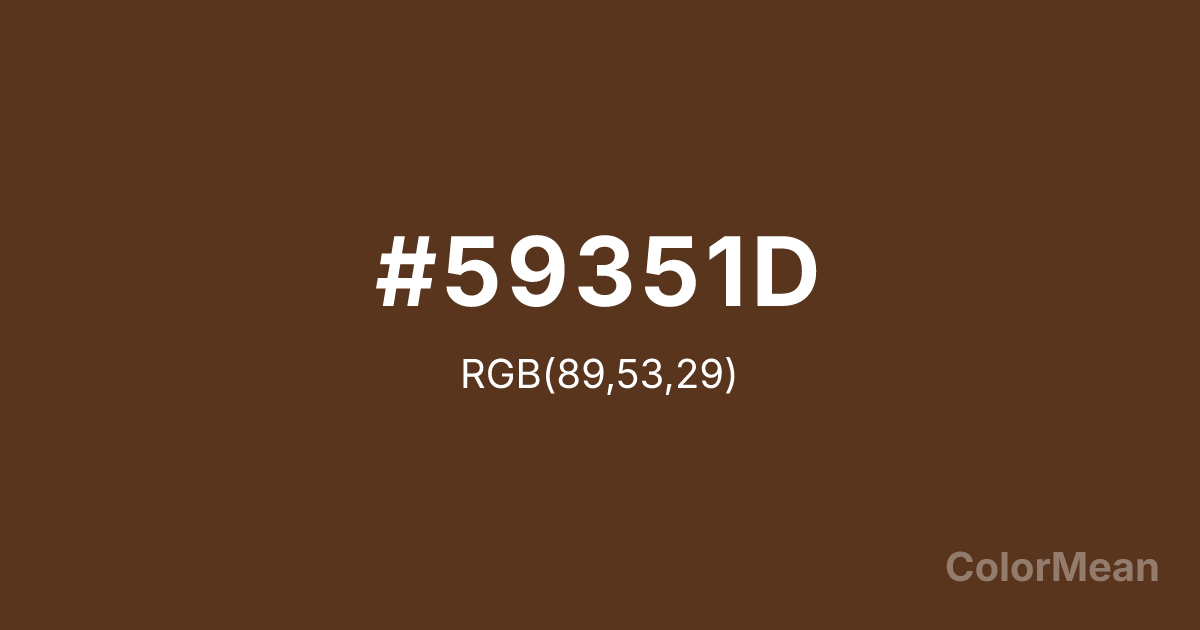 #59351D RGB value is (89, 53, 29). The hex color red value is 89, green is 53, and blue is 29. Its HSL format shows a hue of 24°, saturation of 51 percent, and lightness of 23 percent. The CMYK process values are 0 percent, 40 percent, 67 percent, 65 percent.