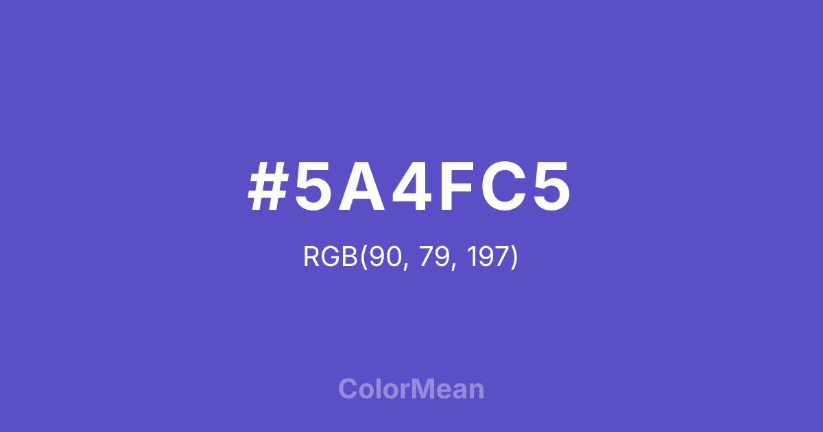 #5A4FC5 RGB value is (90, 79, 197). The hex color red value is 90, green is 79, and blue is 197. Its HSL format shows a hue of 246°, saturation of 50 percent, and lightness of 54 percent. The CMYK process values are 54 percent, 60 percent, 0 percent, 23 percent.