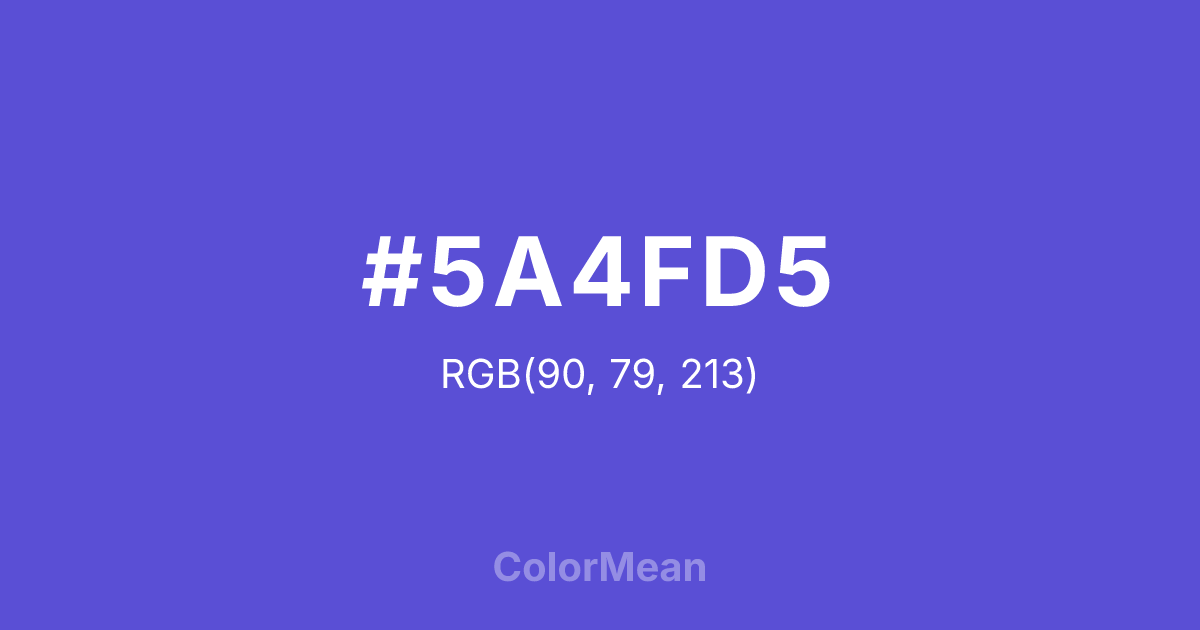 #5A4FD5 RGB value is (90, 79, 213). The hex color red value is 90, green is 79, and blue is 213. Its HSL format shows a hue of 245°, saturation of 61 percent, and lightness of 57 percent. The CMYK process values are 58 percent, 63 percent, 0 percent, 16 percent.