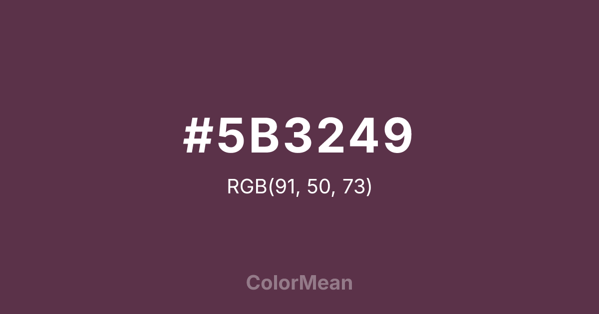 #5B3249 RGB value is (91, 50, 73). The hex color red value is 91, green is 50, and blue is 73. Its HSL format shows a hue of 326°, saturation of 29 percent, and lightness of 28 percent. The CMYK process values are 0 percent, 45 percent, 20 percent, 64 percent.