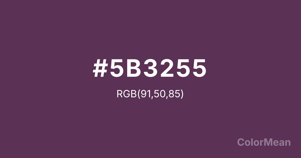 #5B3255 RGB value is (91, 50, 85). The hex color red value is 91, green is 50, and blue is 85. Its HSL format shows a hue of 309°, saturation of 29 percent, and lightness of 28 percent. The CMYK process values are 0 percent, 45 percent, 7 percent, 64 percent.