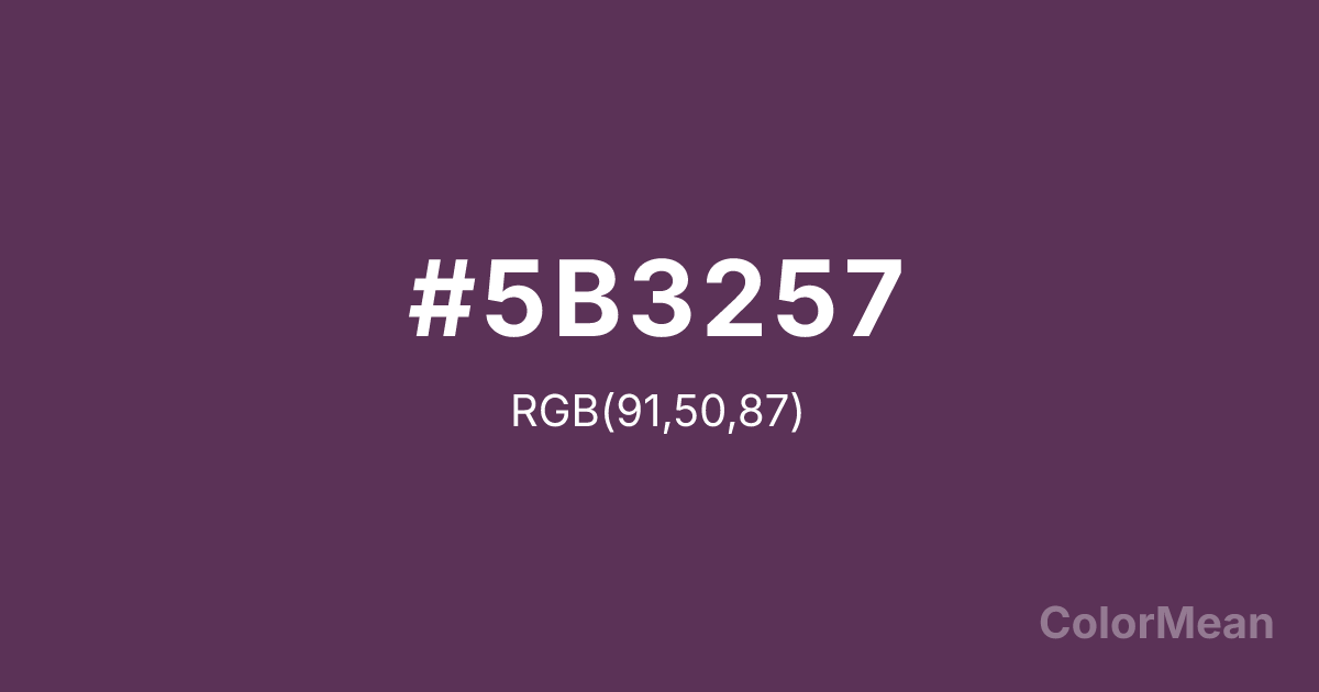 #5B3257 RGB value is (91, 50, 87). The hex color red value is 91, green is 50, and blue is 87. Its HSL format shows a hue of 306°, saturation of 29 percent, and lightness of 28 percent. The CMYK process values are 0 percent, 45 percent, 4 percent, 64 percent.