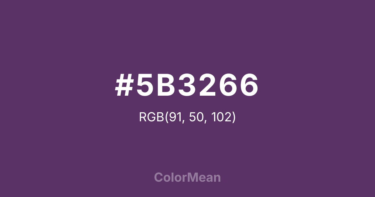 #5B3266 RGB value is (91, 50, 102). The hex color red value is 91, green is 50, and blue is 102. Its HSL format shows a hue of 287°, saturation of 34 percent, and lightness of 30 percent. The CMYK process values are 11 percent, 51 percent, 0 percent, 60 percent.