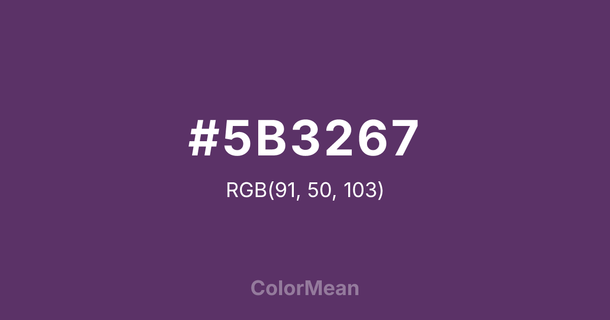 #5B3267 RGB value is (91, 50, 103). The hex color red value is 91, green is 50, and blue is 103. Its HSL format shows a hue of 286°, saturation of 35 percent, and lightness of 30 percent. The CMYK process values are 12 percent, 51 percent, 0 percent, 60 percent.