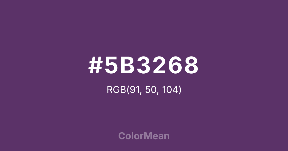 #5B3268 RGB value is (91, 50, 104). The hex color red value is 91, green is 50, and blue is 104. Its HSL format shows a hue of 286°, saturation of 35 percent, and lightness of 30 percent. The CMYK process values are 12 percent, 52 percent, 0 percent, 59 percent.