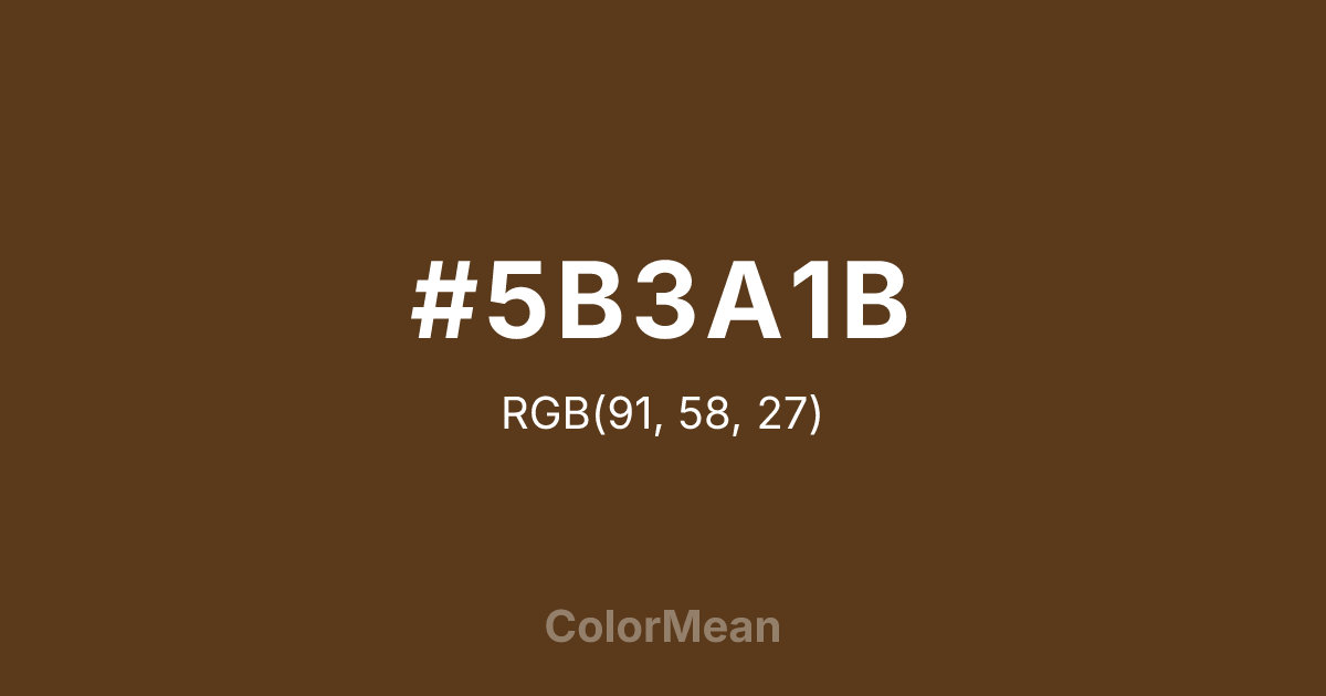 #5B3A1B RGB value is (91, 58, 27). The hex color red value is 91, green is 58, and blue is 27. Its HSL format shows a hue of 29°, saturation of 54 percent, and lightness of 23 percent. The CMYK process values are 0 percent, 36 percent, 70 percent, 64 percent.