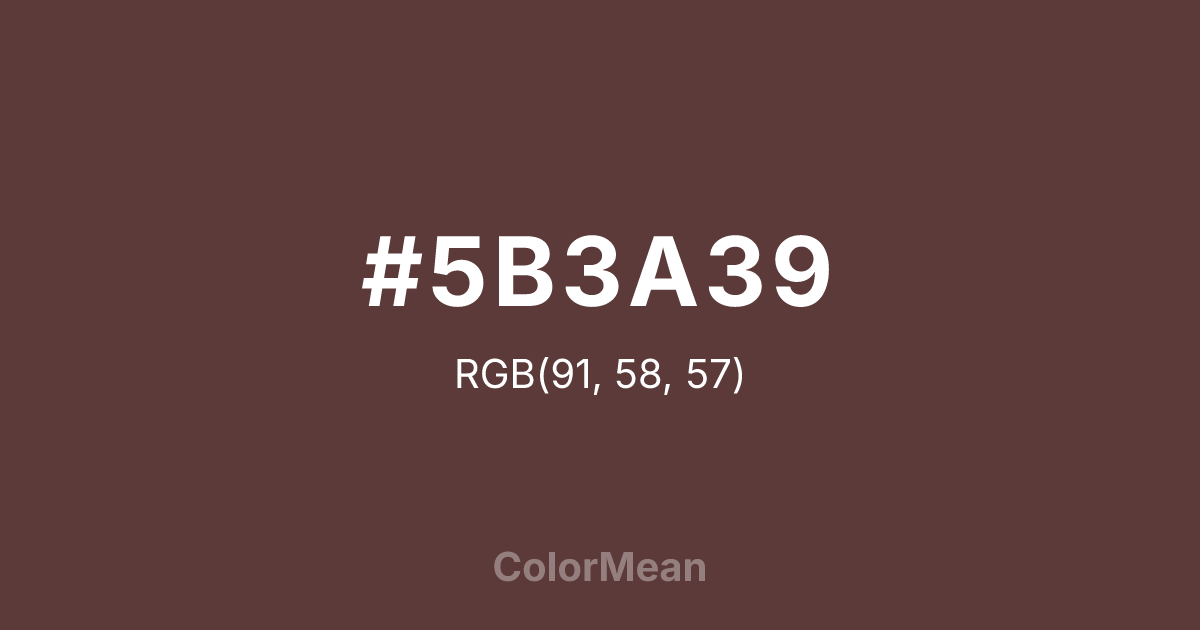 #5B3A39 RGB value is (91, 58, 57). The hex color red value is 91, green is 58, and blue is 57. Its HSL format shows a hue of 2°, saturation of 23 percent, and lightness of 29 percent. The CMYK process values are 0 percent, 36 percent, 37 percent, 64 percent.