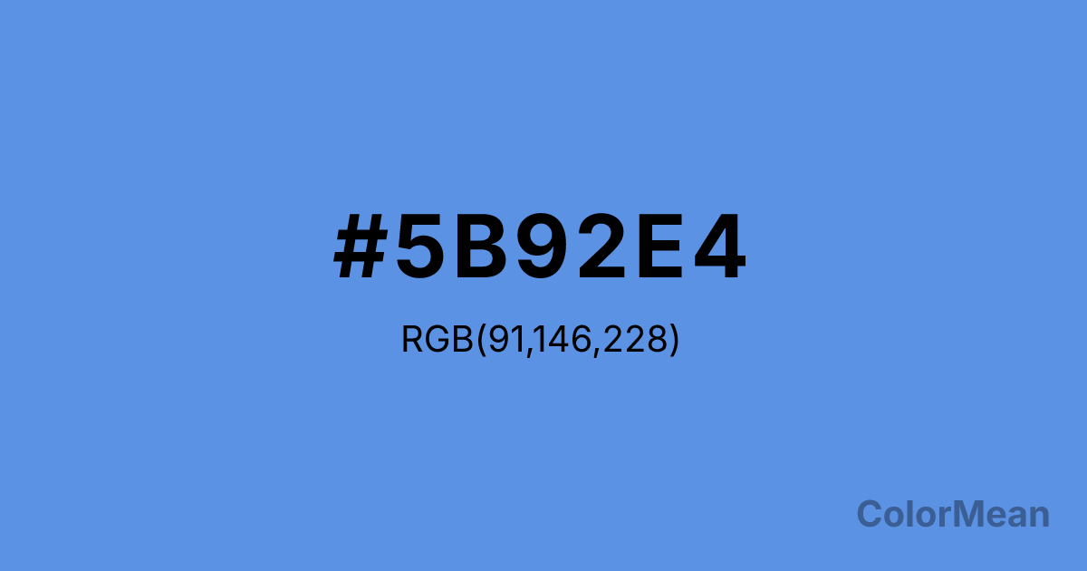 #5B92E4 RGB value is (91, 146, 228). The hex color red value is 91, green is 146, and blue is 228. Its HSL format shows a hue of 216°, saturation of 72 percent, and lightness of 63 percent. The CMYK process values are 60 percent, 36 percent, 0 percent, 11 percent.