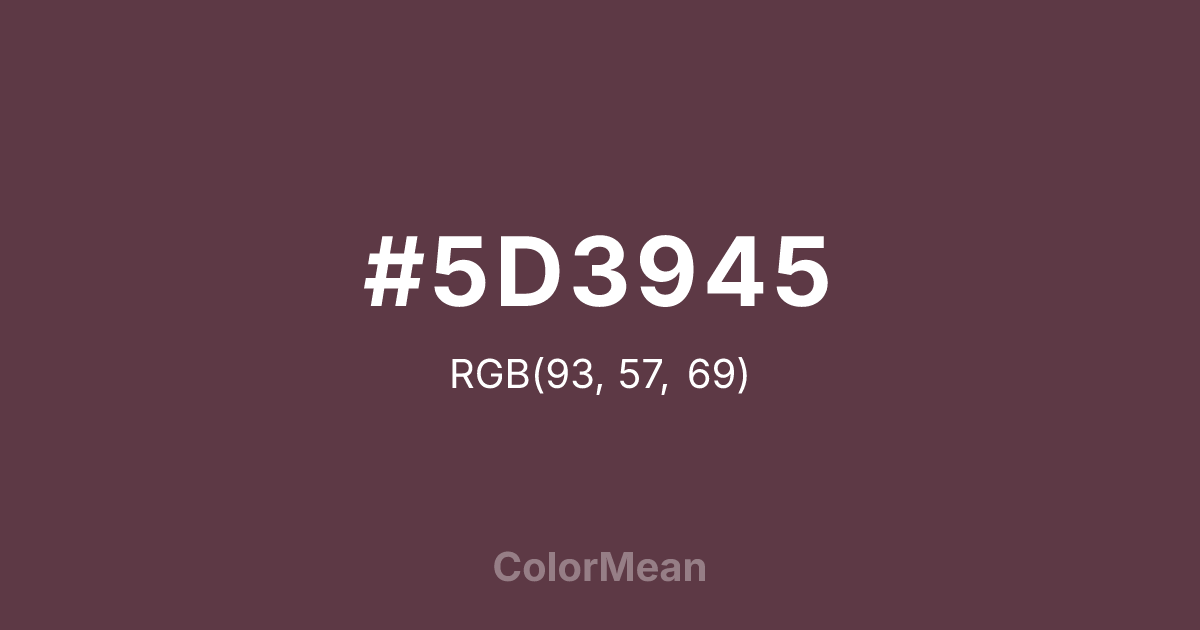 #5D3945 RGB value is (93, 57, 69). The hex color red value is 93, green is 57, and blue is 69. Its HSL format shows a hue of 340°, saturation of 24 percent, and lightness of 29 percent. The CMYK process values are 0 percent, 39 percent, 26 percent, 64 percent.