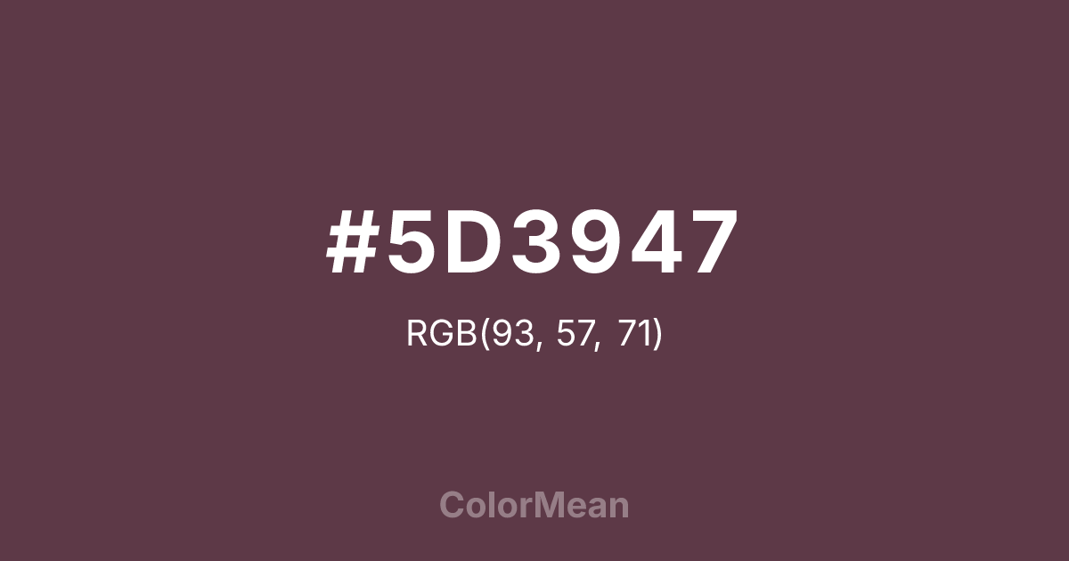 #5D3947 RGB value is (93, 57, 71). The hex color red value is 93, green is 57, and blue is 71. Its HSL format shows a hue of 337°, saturation of 24 percent, and lightness of 29 percent. The CMYK process values are 0 percent, 39 percent, 24 percent, 64 percent.