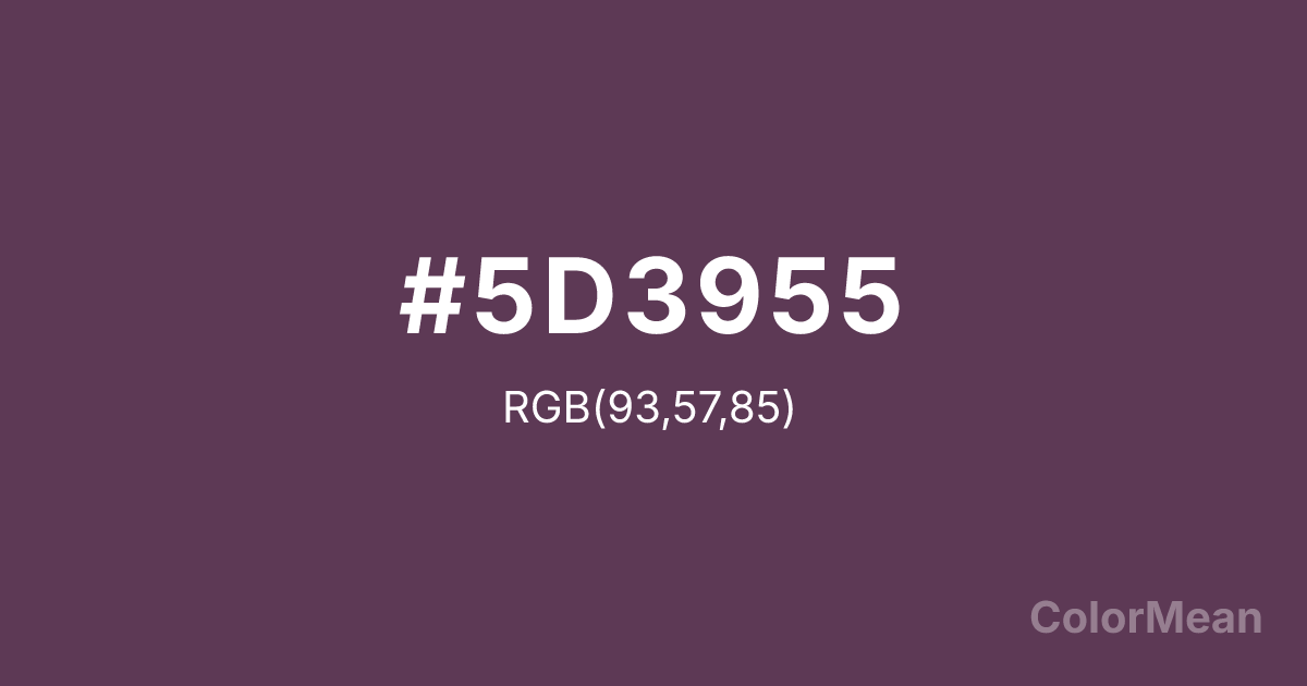 #5D3955 RGB value is (93, 57, 85). The hex color red value is 93, green is 57, and blue is 85. Its HSL format shows a hue of 313°, saturation of 24 percent, and lightness of 29 percent. The CMYK process values are 0 percent, 39 percent, 9 percent, 64 percent.