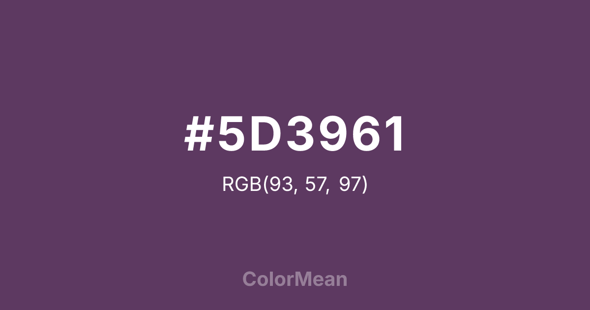 #5D3961 RGB value is (93, 57, 97). The hex color red value is 93, green is 57, and blue is 97. Its HSL format shows a hue of 294°, saturation of 26 percent, and lightness of 30 percent. The CMYK process values are 4 percent, 41 percent, 0 percent, 62 percent.