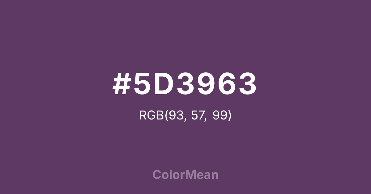#5D3963 RGB value is (93, 57, 99). The hex color red value is 93, green is 57, and blue is 99. Its HSL format shows a hue of 291°, saturation of 27 percent, and lightness of 31 percent. The CMYK process values are 6 percent, 42 percent, 0 percent, 61 percent.