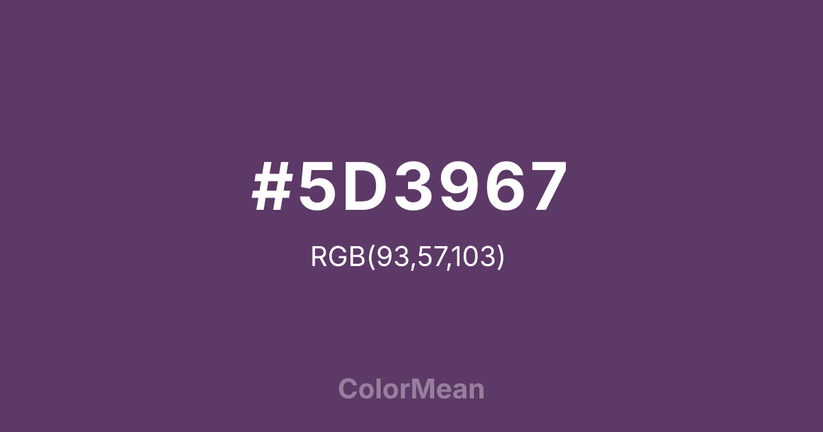 #5D3967 RGB value is (93, 57, 103). The hex color red value is 93, green is 57, and blue is 103. Its HSL format shows a hue of 287°, saturation of 29 percent, and lightness of 31 percent. The CMYK process values are 10 percent, 45 percent, 0 percent, 60 percent.