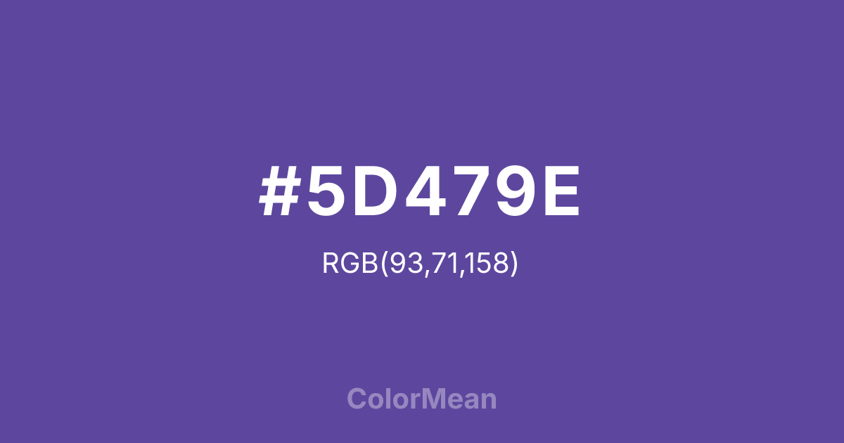 #5D479E RGB value is (93, 71, 158). The hex color red value is 93, green is 71, and blue is 158. Its HSL format shows a hue of 255°, saturation of 38 percent, and lightness of 45 percent. The CMYK process values are 41 percent, 55 percent, 0 percent, 38 percent.