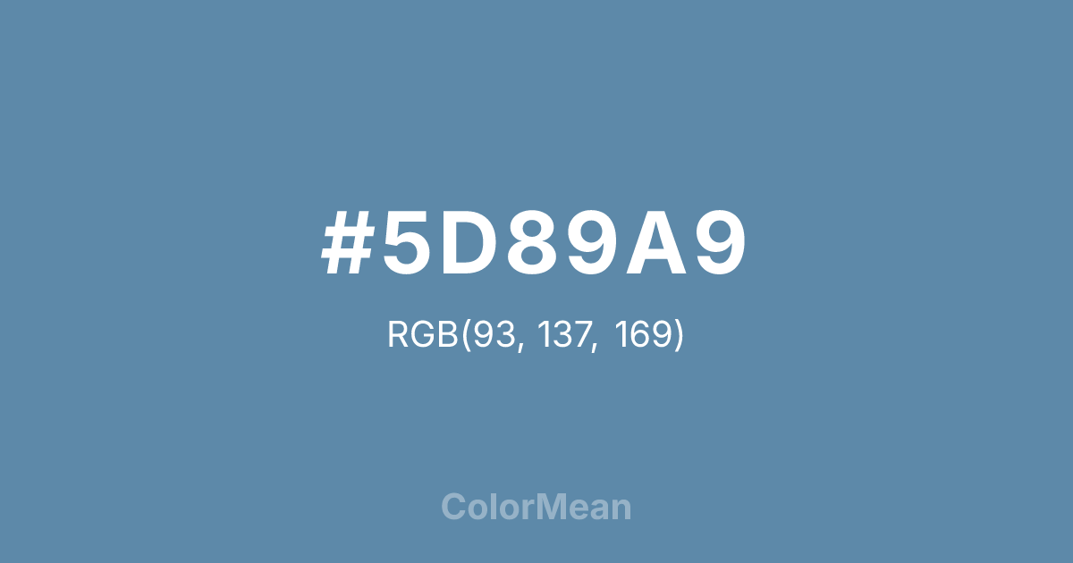 #5D89A9 RGB value is (93, 137, 169). The hex color red value is 93, green is 137, and blue is 169. Its HSL format shows a hue of 205°, saturation of 31 percent, and lightness of 51 percent. The CMYK process values are 45 percent, 19 percent, 0 percent, 34 percent.