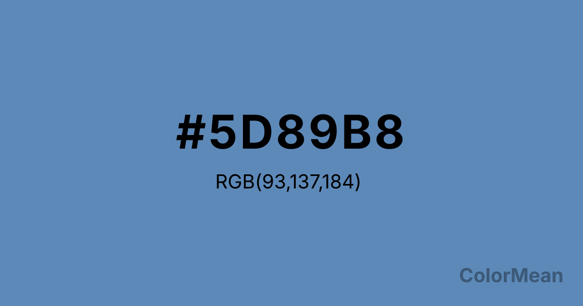 #5D89B8 RGB value is (93, 137, 184). The hex color red value is 93, green is 137, and blue is 184. Its HSL format shows a hue of 211°, saturation of 39 percent, and lightness of 54 percent. The CMYK process values are 49 percent, 26 percent, 0 percent, 28 percent.