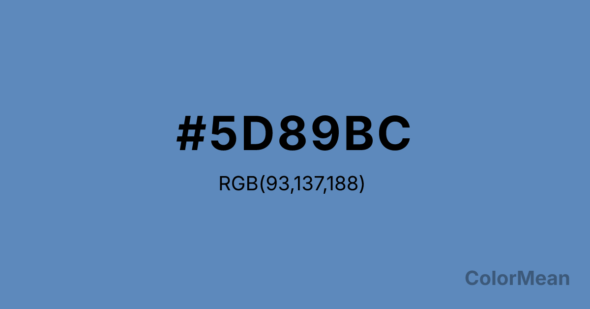 #5D89BC RGB value is (93, 137, 188). The hex color red value is 93, green is 137, and blue is 188. Its HSL format shows a hue of 212°, saturation of 41 percent, and lightness of 55 percent. The CMYK process values are 51 percent, 27 percent, 0 percent, 26 percent.