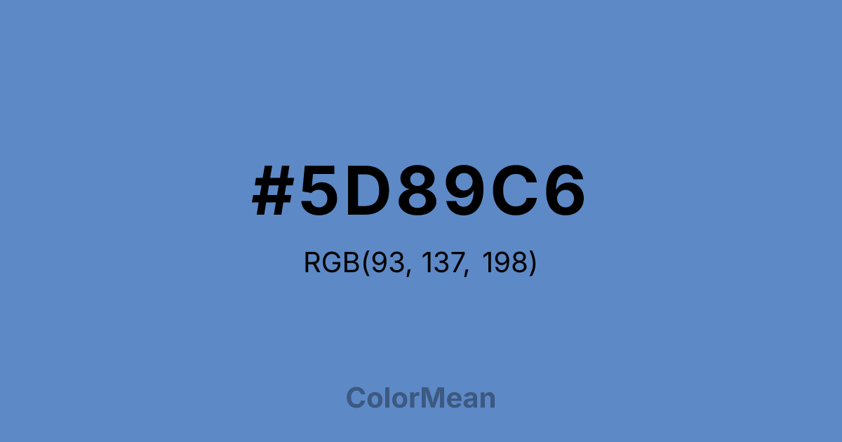 #5D89C6 RGB value is (93, 137, 198). The hex color red value is 93, green is 137, and blue is 198. Its HSL format shows a hue of 215°, saturation of 48 percent, and lightness of 57 percent. The CMYK process values are 53 percent, 31 percent, 0 percent, 22 percent.