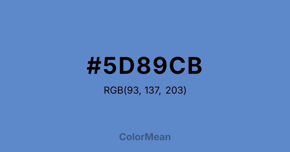 #5D89CB RGB value is (93, 137, 203). The hex color red value is 93, green is 137, and blue is 203. Its HSL format shows a hue of 216°, saturation of 51 percent, and lightness of 58 percent. The CMYK process values are 54 percent, 33 percent, 0 percent, 20 percent.