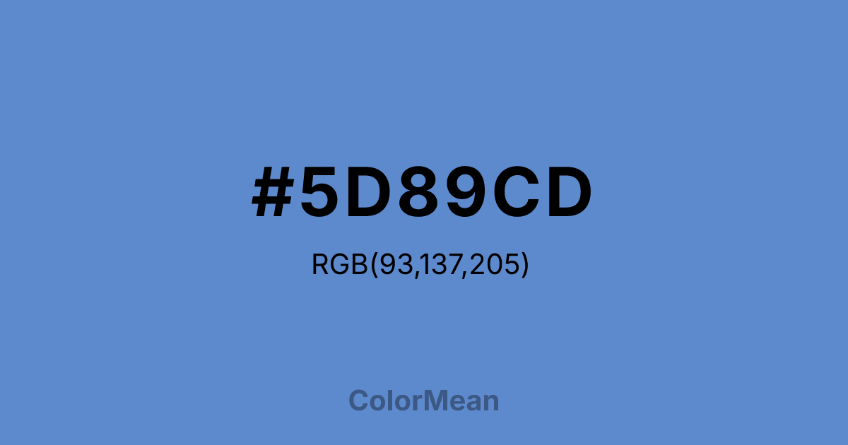 #5D89CD RGB value is (93, 137, 205). The hex color red value is 93, green is 137, and blue is 205. Its HSL format shows a hue of 216°, saturation of 53 percent, and lightness of 58 percent. The CMYK process values are 55 percent, 33 percent, 0 percent, 20 percent.