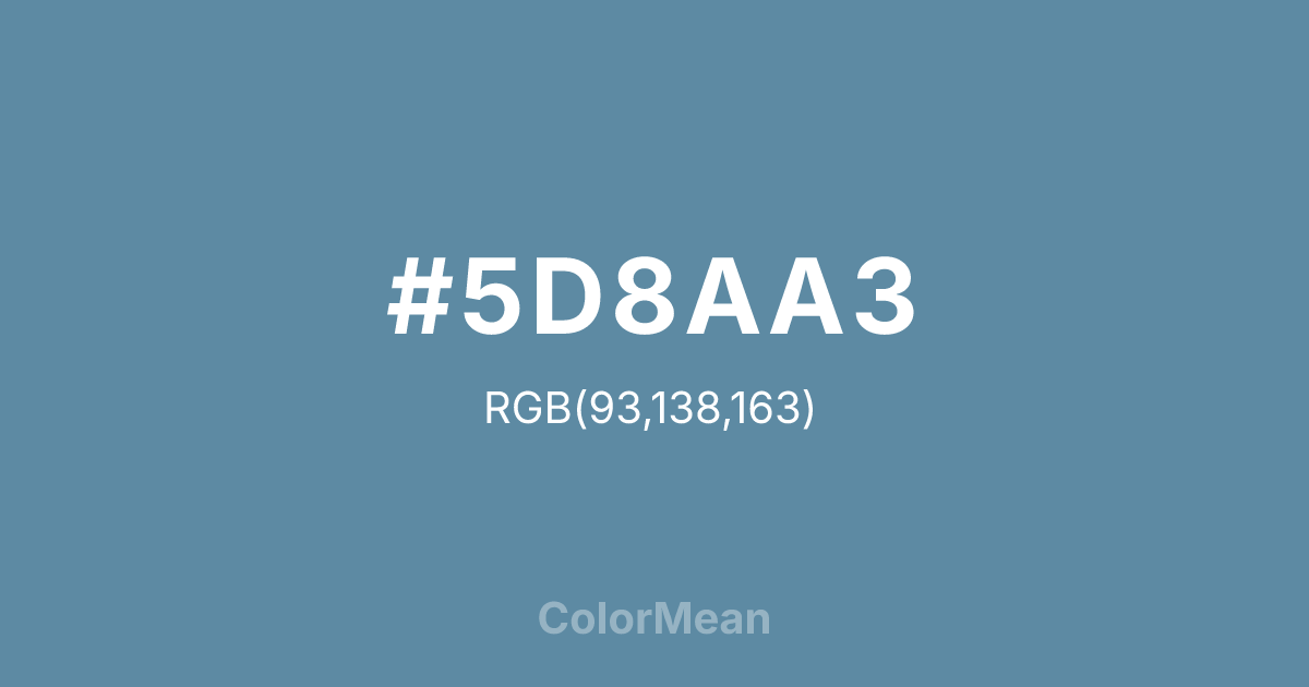 #5D8AA3 RGB value is (93, 138, 163). The hex color red value is 93, green is 138, and blue is 163. Its HSL format shows a hue of 201°, saturation of 28 percent, and lightness of 50 percent. The CMYK process values are 43 percent, 15 percent, 0 percent, 36 percent.