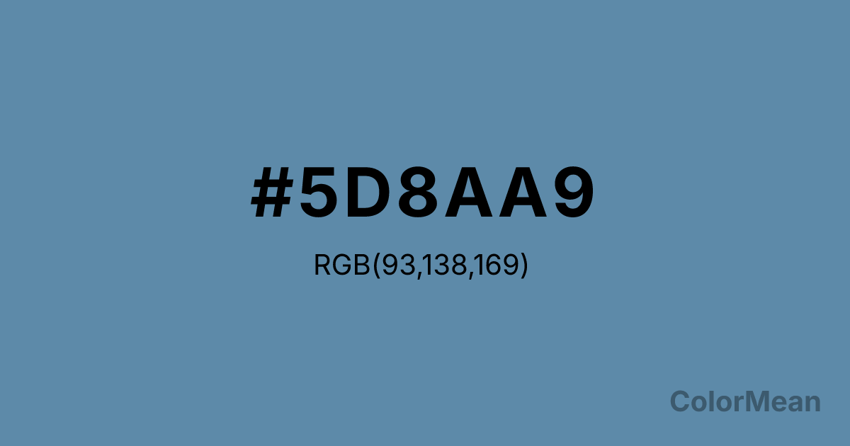 #5D8AA9 RGB value is (93, 138, 169). The hex color red value is 93, green is 138, and blue is 169. Its HSL format shows a hue of 204°, saturation of 31 percent, and lightness of 51 percent. The CMYK process values are 45 percent, 18 percent, 0 percent, 34 percent.