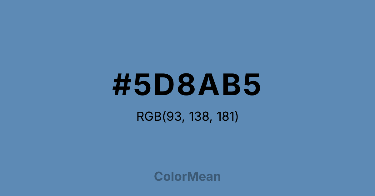 #5D8AB5 RGB value is (93, 138, 181). The hex color red value is 93, green is 138, and blue is 181. Its HSL format shows a hue of 209°, saturation of 37 percent, and lightness of 54 percent. The CMYK process values are 49 percent, 24 percent, 0 percent, 29 percent.
