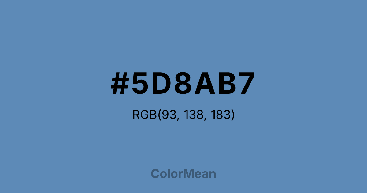 #5D8AB7 RGB value is (93, 138, 183). The hex color red value is 93, green is 138, and blue is 183. Its HSL format shows a hue of 210°, saturation of 38 percent, and lightness of 54 percent. The CMYK process values are 49 percent, 25 percent, 0 percent, 28 percent.